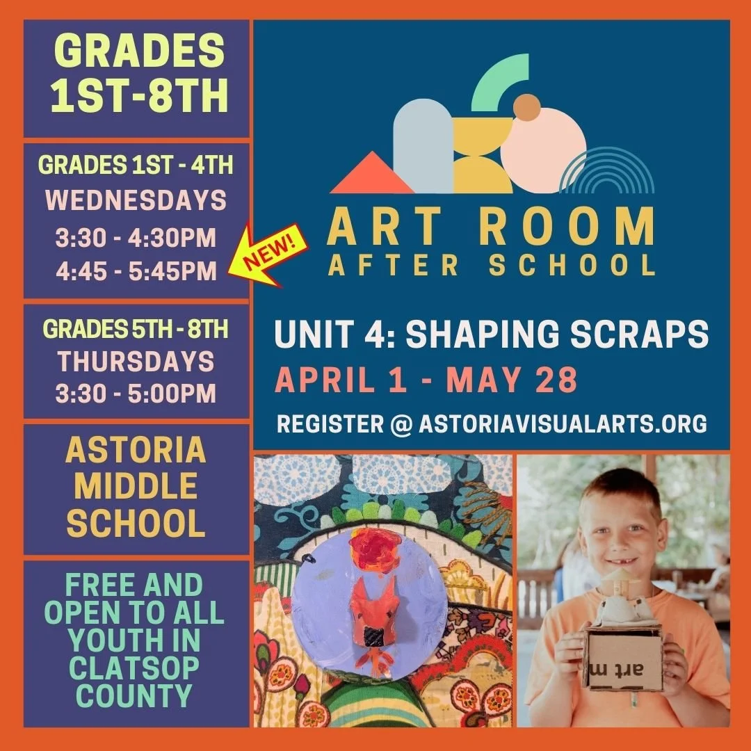 Art Room After School supports the social, emotional, and academic growth of Clatsop County youth. Because every child deserves access to meaningful art experiences, these classes are free. Students explore new materials and hands-on projects that build confidence and develop creative voice and self-expression. This program is open to all students in Clatsop County.