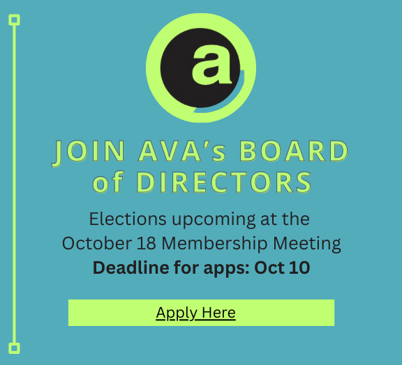 AVA is Moving! Join AVA's Board Member Show & Meeting RESIST, Nov 8-30 Missy StRain AVA's a-i-r The Newsletter Slide 1 Slide 1 (current slide) Slide 2 Slide 2 (current slide) Slide 3 Slide 3 (current slide) Slide 4 Slide 4 (current slide) Slide 5 Slide 5 (current slide) Slide 6 Slide 6 (current slide) Slide 7 Slide 7 (current slide) We Are Moving!!! Join AVA's Board Member Show & Meeting COAR Exhibit, Oct 11-25 RESIST, Nov 8-30 Missy StRain, AVA's a-i-r AVA Newsletter